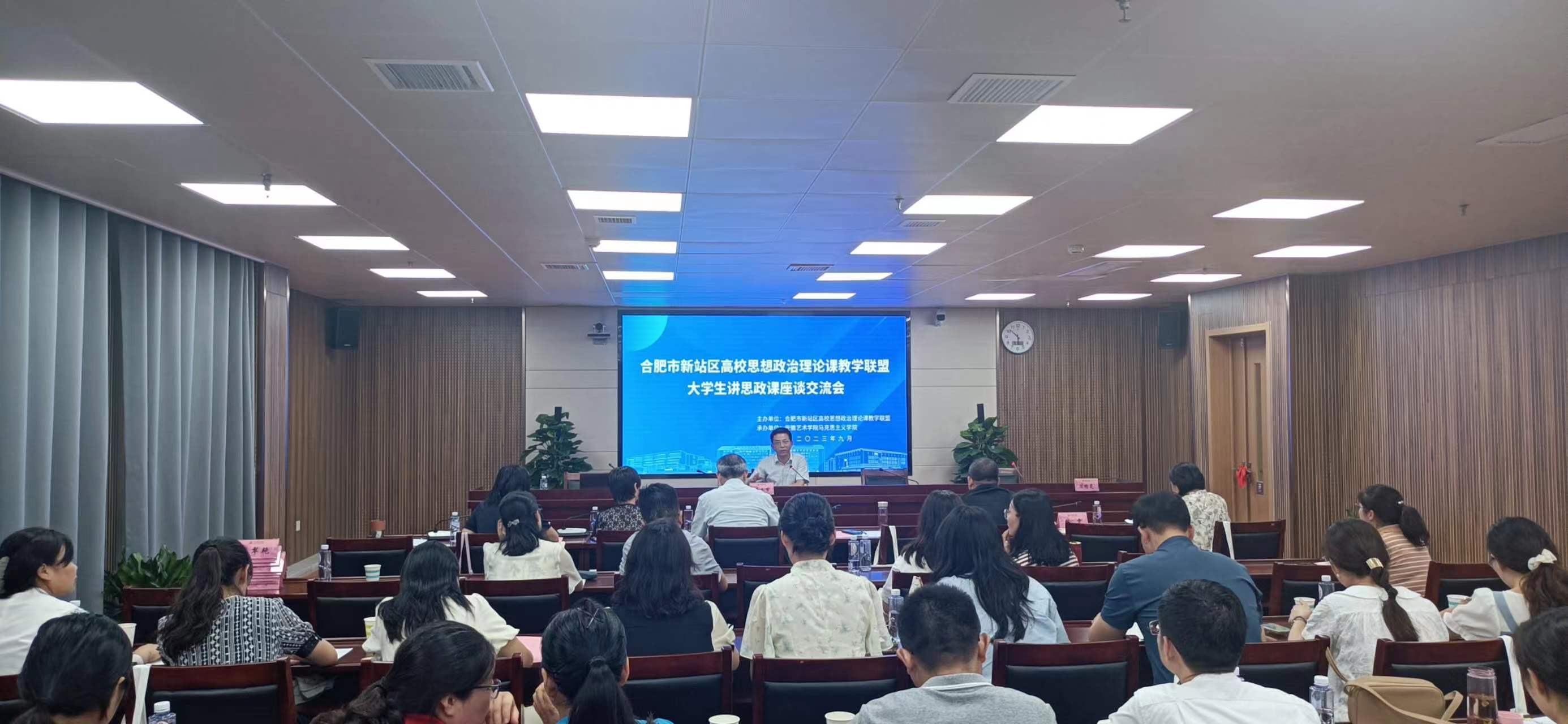 为开展好全省第二届大学生讲思政课展示活动,深化思政课改革创新,推进“大思政课”建设,9月6日下午,由新站区高校思想政治理论课教学联盟(以下称“教学联盟”)主办,安徽艺术学院马克思主义学院承办的“大学生讲思政课”座谈交流会在我校举行。教学联盟9所高校的马克思主义学院负责人以及相关思政课教师60余人参加会议。校党委委员、副校长柳友荣与会致辞。会议由马克思主义学院院长吴孔铎主持。