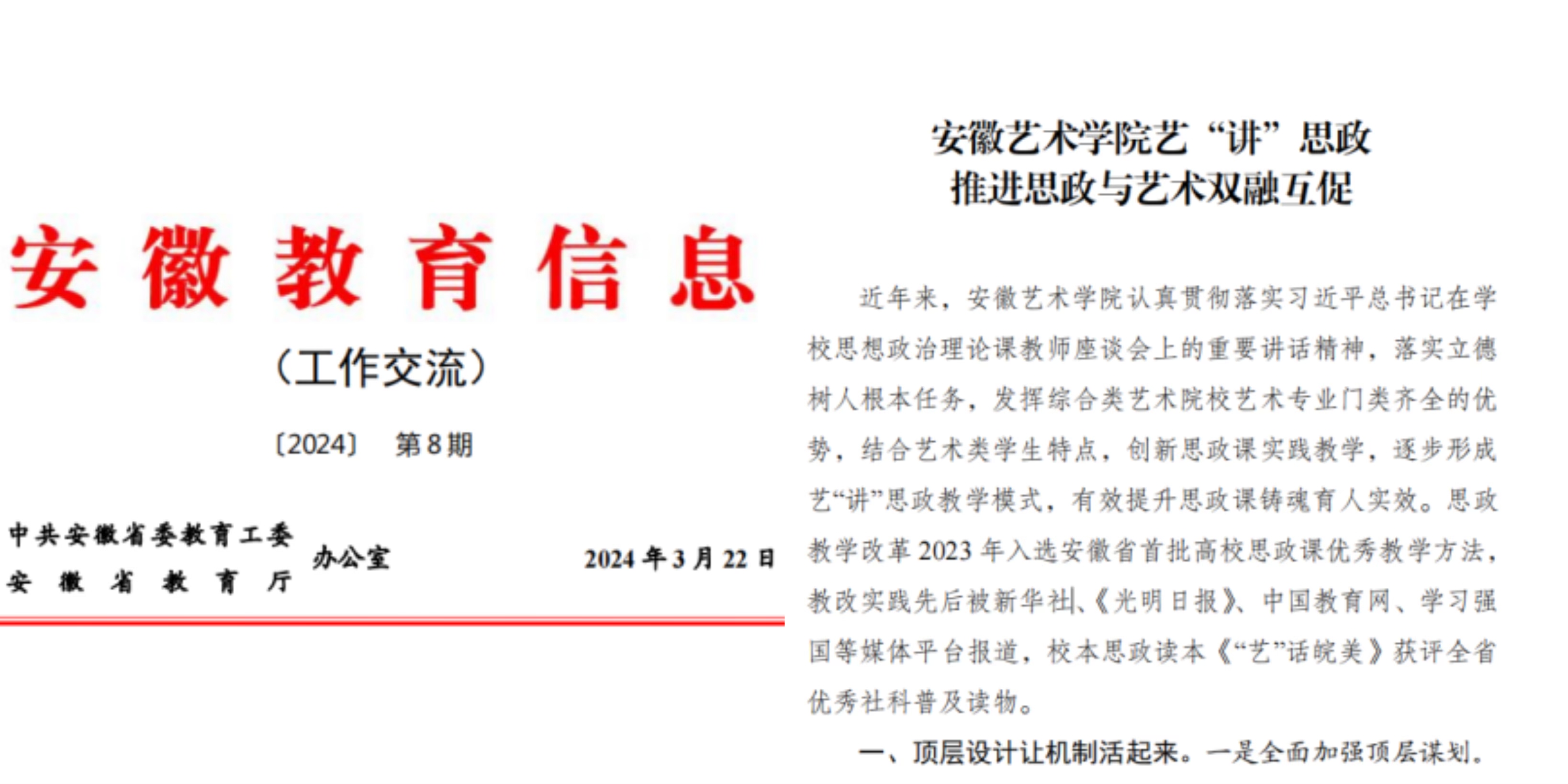 近日,由省委教育工委、省教育厅编印的《安徽教育信息》在2024年第8期以《安徽艺术学院艺“讲”思政推进思政与艺术双融互促》为题,专题报道了我校艺“讲”思政教学方法。