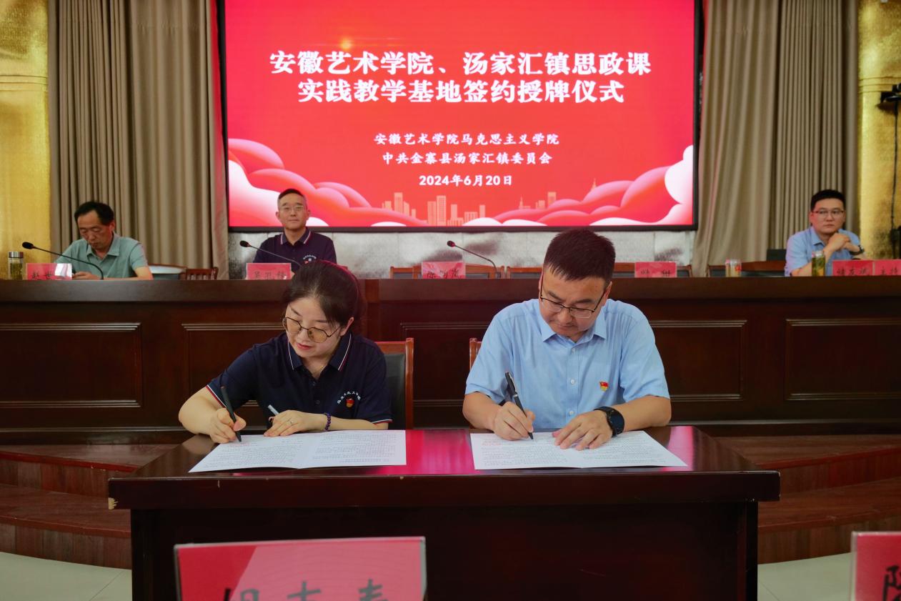6月20日下午,签约会在汤家汇镇政府大礼堂举行。汤家汇镇党委书记叶甜首先对马克思主义学院一行表示热烈欢迎,并简要介绍了汤家汇镇的红色资源。他表示,汤家汇镇丰富的红色遗存是开展大学生思想政治教育的天然课堂,希望双方以此为契机,深挖当地红色资源,为安徽艺术学院思政课实践教学改革赋能。马克思主义学院直属党支部书记陈昀岚对汤家汇镇党委政府领导同志的热情接待和对实践基地建设所给予的大力支持表示诚挚感谢,并表示未来将定期组织学生来此开展形式丰富的思政课活动,以革命文化丰富思政课教学,把思政课小课堂和社会大课堂起来,更好发挥思政课立德树人关键课程的作用。会议由汤家汇镇镇长储友斌主持,马克思主义学院一行及汤家汇镇相关领导出席了签约仪式。