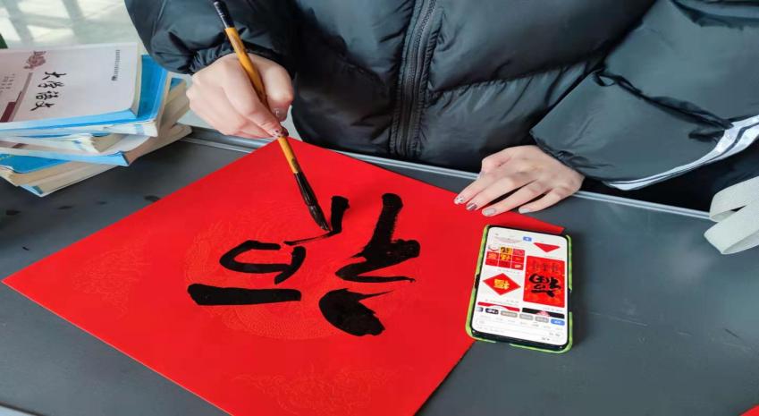 同学们带着新年的祝福挥毫泼墨,笔走龙蛇,全神贯注书写着春联,个个忙得不亦乐乎。把一幅幅体现着“欢乐和谐”、“平安祥和”等主题的春联无偿送到师生手中。会场里的每个人都有条不紊地做着相关工作,整个会场都被喜庆的红色渲染了。