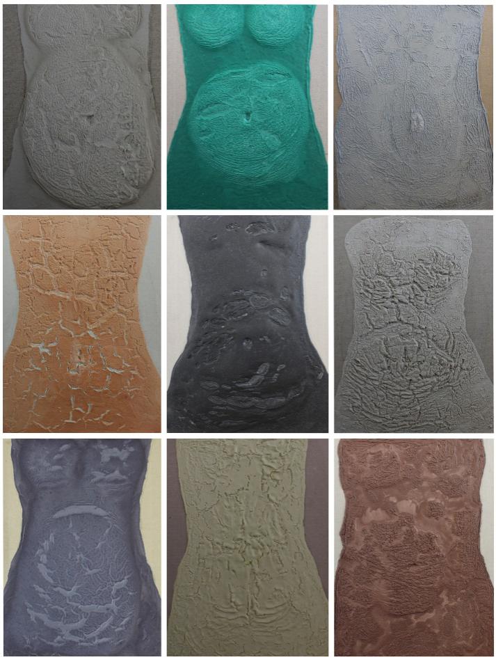 技法制作过程:白乳胶与腻子粉7:3的比例进行调和,根据情况加少量水,搅拌均匀后加入丙烯颜料继续调和直至颜色达到理想效果。在绷好画布的四开板子上,绘制出具有女性特征的躯干外形,把调和好的混合物倒在画布上,要注意混合物的流淌轨迹切勿超出绘制的范围。将混合物铺满躯干,在胸部与肚子处继续加混合物,作品表面有起伏变化。接下来用吹风机将表面吹干,在下层湿润的情况下,挤压,推,或立起板子让混合物流淌,因为表面是半干的情况下会出现女性分娩后的妊娠纹与皮肤下垂,松弛的感觉。在这个过程要反复吹干,推挤,再吹干再推挤,直到完全干燥。