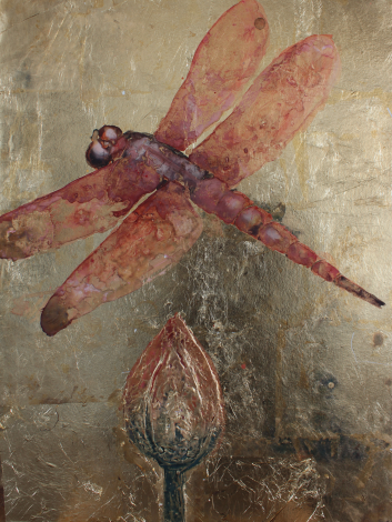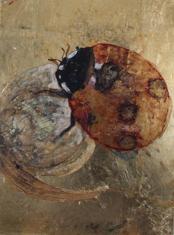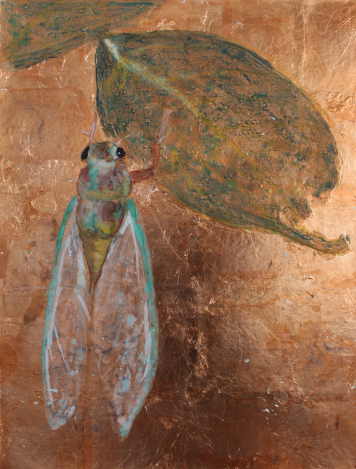 技法、制作过程:先用腻子粉加上白乳胶做出肌理感,然后在板上堆砌出想要的形状。等待变干,用铜箔覆盖一层,再把形拓上去,最后用矿物质颜料以“撞色”的方式画出昆虫的形。