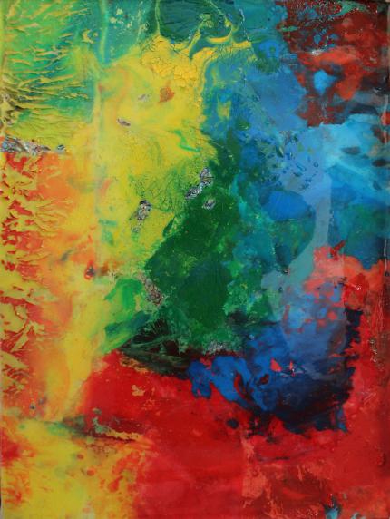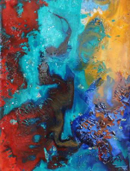 材料作品技法说明:材料上主使用了木板,亚麻布,白乳胶,水粉颜料,螺钿,宣纸和环氧树脂。首先将水粉颜料按照一定比例稀释后泼撒在宣纸上,再将泼出的图形重新裁剪、组合拼贴,最后用环氧树脂封层。