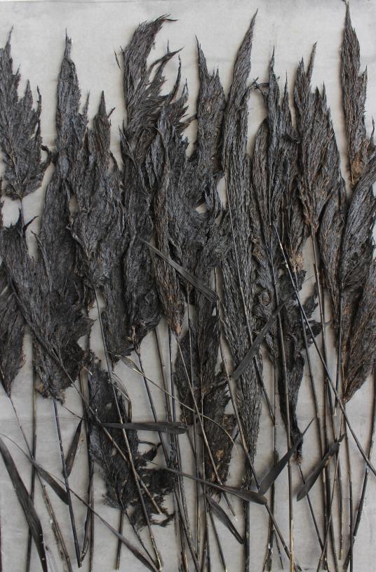 创作阐述:水墨画中的芦苇就很有魅力,如果运用到了综合材料中将二者结合,黑白灰层次感会更丰富。作品采用干芦苇为原料,用墨着色。芦苇形态往一边微微倾斜,仿佛有风吹过,从而给予观者很好的视觉效果,以此让观者看到另一种“中国水墨画”的感觉。