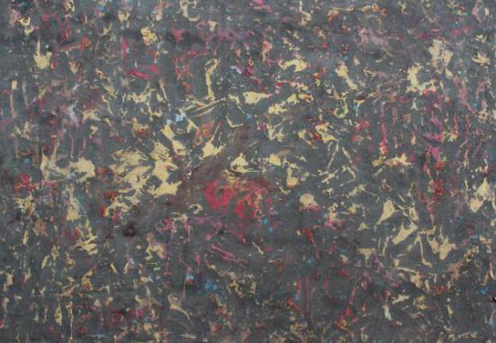 技法、制作过程:先用泼过墨的生宣揉成自己想到的形状然后用白乳胶粘贴上去,出来大致的图案形状形成后,用白乳胶加腻子粉搅匀,结合自己的画面效果泼上去,如需要色与色之间的碰撞,可在搅匀的白乳胶和腻子粉中加入墨或者少量的颜色泼上去,让整个画面产生颜色的融合与碰撞。