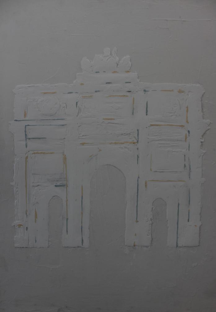 技法、制作过程:用准备好的的凯旋门图片拓印在板子上,再用搅拌均匀的腻子粉和白乳胶按照凯旋门的形状,铺在上面,做出立体的效果,之后,再用砂纸打磨,用工具找到自己想要的线条刻出来凹槽,下一步,把白乳胶和腻子粉调和再加入水粉颜料,注入凹槽里,等待干后,再次用砂纸打磨。