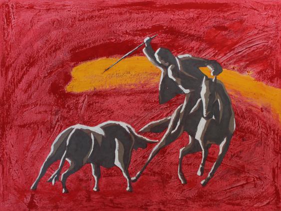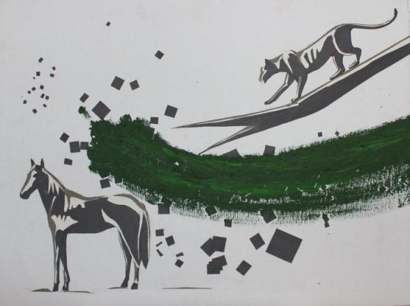 我的这幅系列作品在选题开始,我的灵感来源于一副用色艳丽大胆的一副网络作品,它并没有很华丽很浮夸的装饰,作品风格显得整体统一,仅仅是用颜色就能让人眼光停留。于是本着专业本能,我开始尝试于制作这种风格的作品,并以马为作品的主体物,马在中国传统文化中总是寓意着积极的意思,中国很多的文人大师也酷爱以马为主题做画。整幅作品的制作中,我用勾兑的腻子粉塑造出骏马的形象,并且尽量使得马的身形轮廓显得俊俏挺拔,英姿飒爽,不完全具象但又突出骏马的气质。虽然用黑色作为第二层底色,最后再用自己想用的颜色在马的身形与背景之间适当跟上,让整副画面既有黑色又有自己喜欢的颜色,最后在老师的指导下,我对马的身体进行了打磨,使其漏出一点点原有的白色勾勒马的身形,这样不仅仅显得马更加精神,在色彩上也更加的丰富多彩。