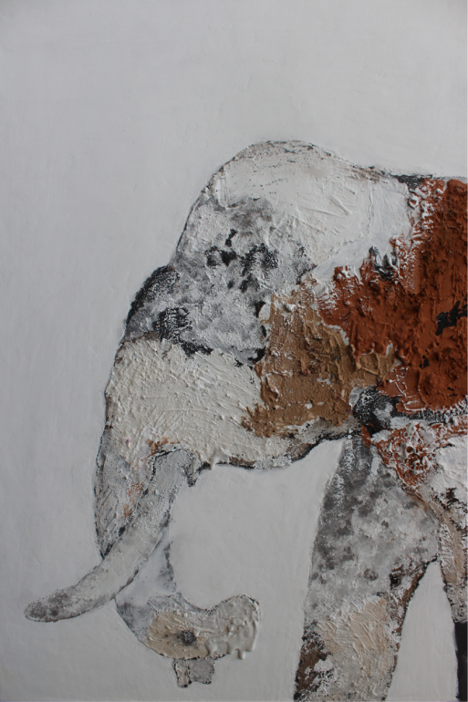 技法、制作过程:制作首先把大象的外形拓在木板上,先铺底层,用白乳胶、腻子粉混合涂抹,需肌理粗糙感的部分用黄沙表现,小部分用红色砖粉混合腻子粉涂抹,表现色彩的层次。腻子的堆砌,混合红褐色砖粉堆砌,再加上黑色晕染,所组成的一幅画充满了肌理视觉效果的画面。