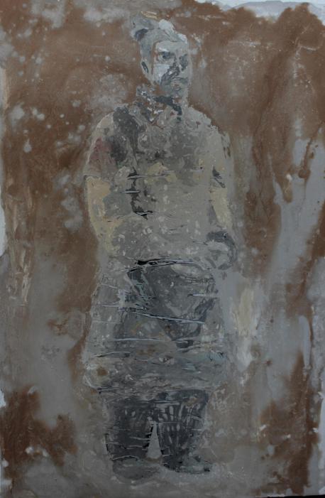 技法、制作过程:先用腻子粉加白乳胶在亚麻布板子上做底,再在做好的底板上起型,用腻子粉加白乳胶调入颜料在打好的型中堆砌出外形,等到晾干后用砂纸打磨,再用水泥加水和红砖泥土加水,分别泼到画面上形成颜色融合,等到晾干再进行打磨,从而达到一种尘封的历史感。