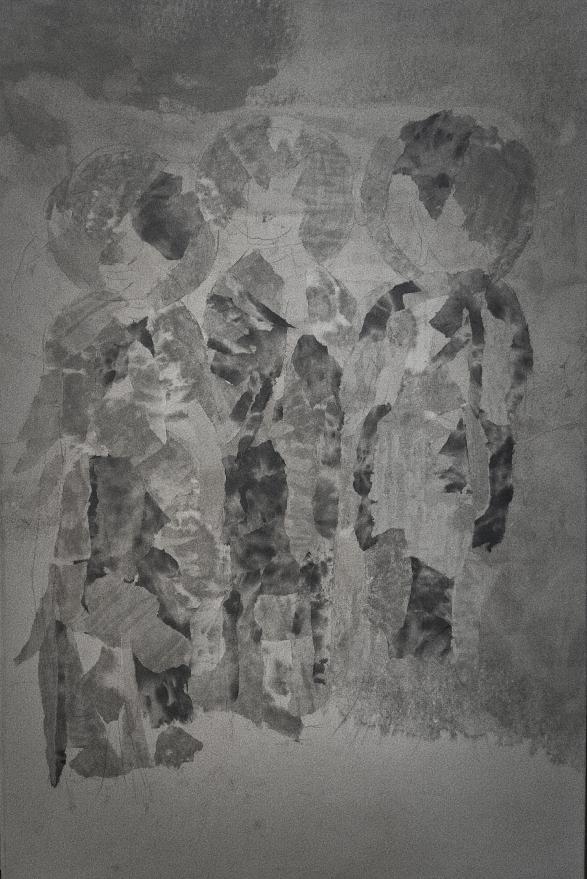 材料作品技法说明:材料上主是要木板,亚麻布,白乳胶,腻子粉,国画墨,水粉颜料,但是是以剪纸为主要核心,以纸折裁出各种形状相互拼合,组成我想要达到的形状。但前期我以腻子,颜料,国画水墨画出大背景,之后在粘合纸张表现形状,之后再主观处理,用水粉颜料添加氛围,达到不同的视觉体验。