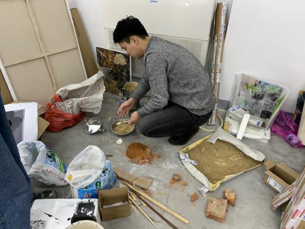 材料选择:木板、亚麻布、白乳胶、腻子粉、水粉颜料、泥土、水泥、红砖粉末。