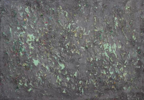 技法、制作过程:先用泥土和红砖粉末加上白乳胶做层有肌理感的底并在上面涂抹蓝色作为背景,在背景板上用麻绳勾勒出山的大概山的形状,并在区域内预埋粗细不同的绳子。在用不同浓度与不同颜色比例的腻子粉白乳胶调配的颜料在背景上进行堆砌。在用不同的颜色对比做出山的一个层次,在画面半干状态下,把提前预埋的绳取出,做出一种不同的肌理效果和不同的颜色视觉效果。达到一种形散神聚并颜色丰富山石的状态。
