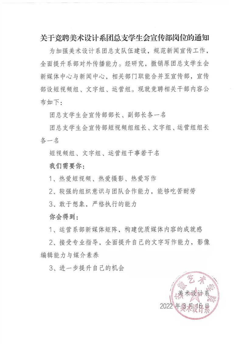 关于竞聘美术设计系团总支学生会选出宣传部岗位的通知