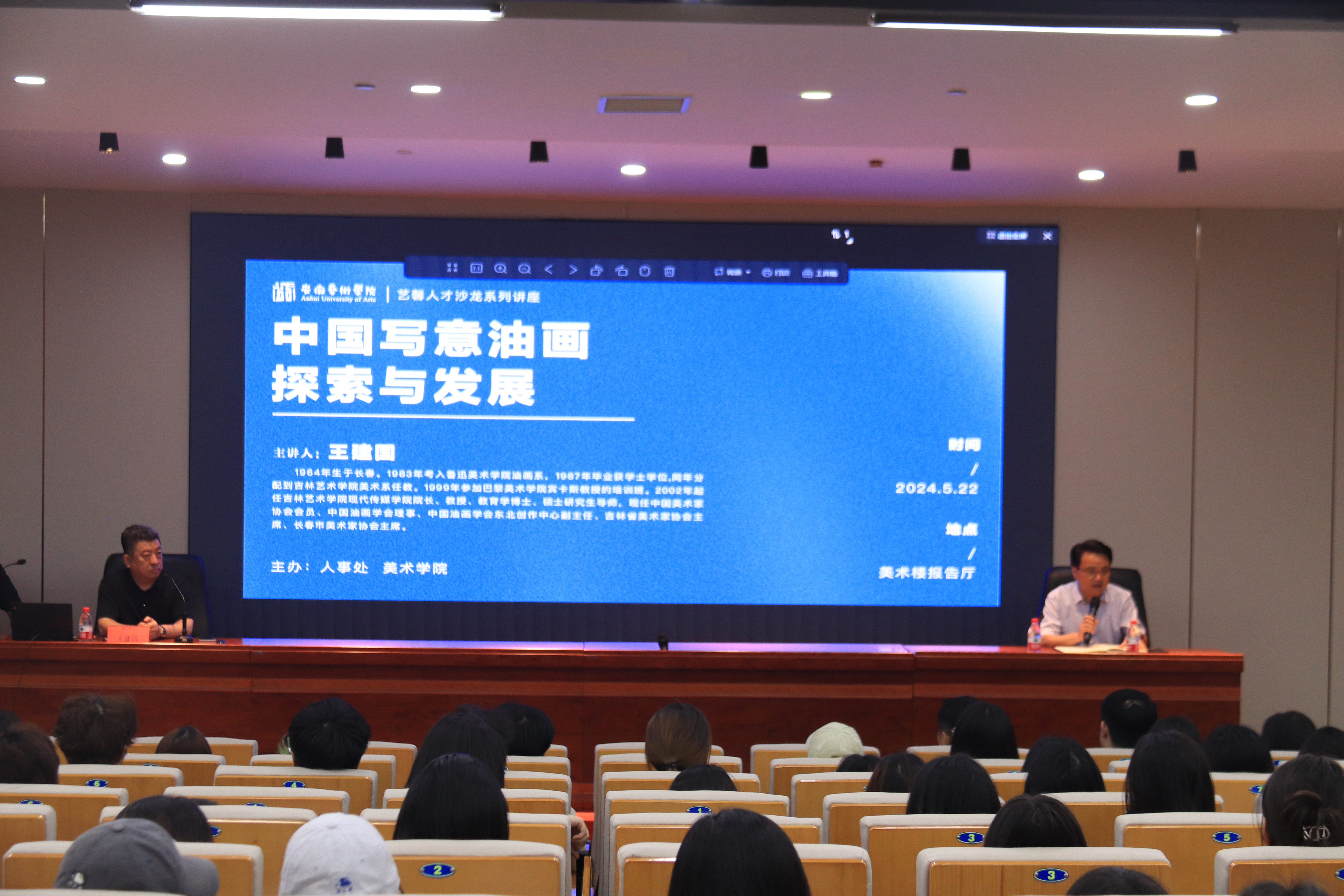 5月22日,在安徽艺术学院美术楼举行了吉林省美术家协会主席、东北师范大学博士生导师王建国教授任安徽艺术学院油画研究院院长的受聘仪式暨 “中国写意油画探索与发展”主题讲座。美术学院党总支书记陈明海主持。