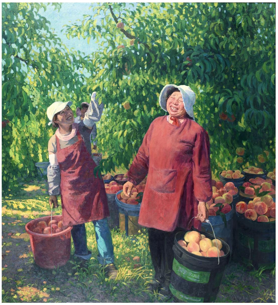 这幅作品《桃子熟了》描绘了皖北乡村农民收获桃子的情景,清晨,在桃树园里,她们一边收获果实,一边聊起家长里短,脸上洋溢着喜悦的笑容,阳光、枝叶、果实、农民、土地,一切都是非常的美丽而又浪漫的。在构图方面,以农民形象作为画面的视觉中心,略微夸大了人物的倾斜程度,从而形成一种活泼、动感的感觉,在色彩方面,注重对光与色的描绘,人物脸部的红色、衣服和果实的红色与背景中的绿色和蓝色形成了强烈的对比,同时这些色彩都被笼罩在温暖灿烂的阳光下,变得和谐且富有感染力,通过对人物形象的刻画、对色彩与构图的分析和安排,营造出一种温暖、灿烂、明媚、喜悦、和谐的氛围,表现劳动人民质朴、勤劳、善良的性格以及内心深处的幸福与温情。