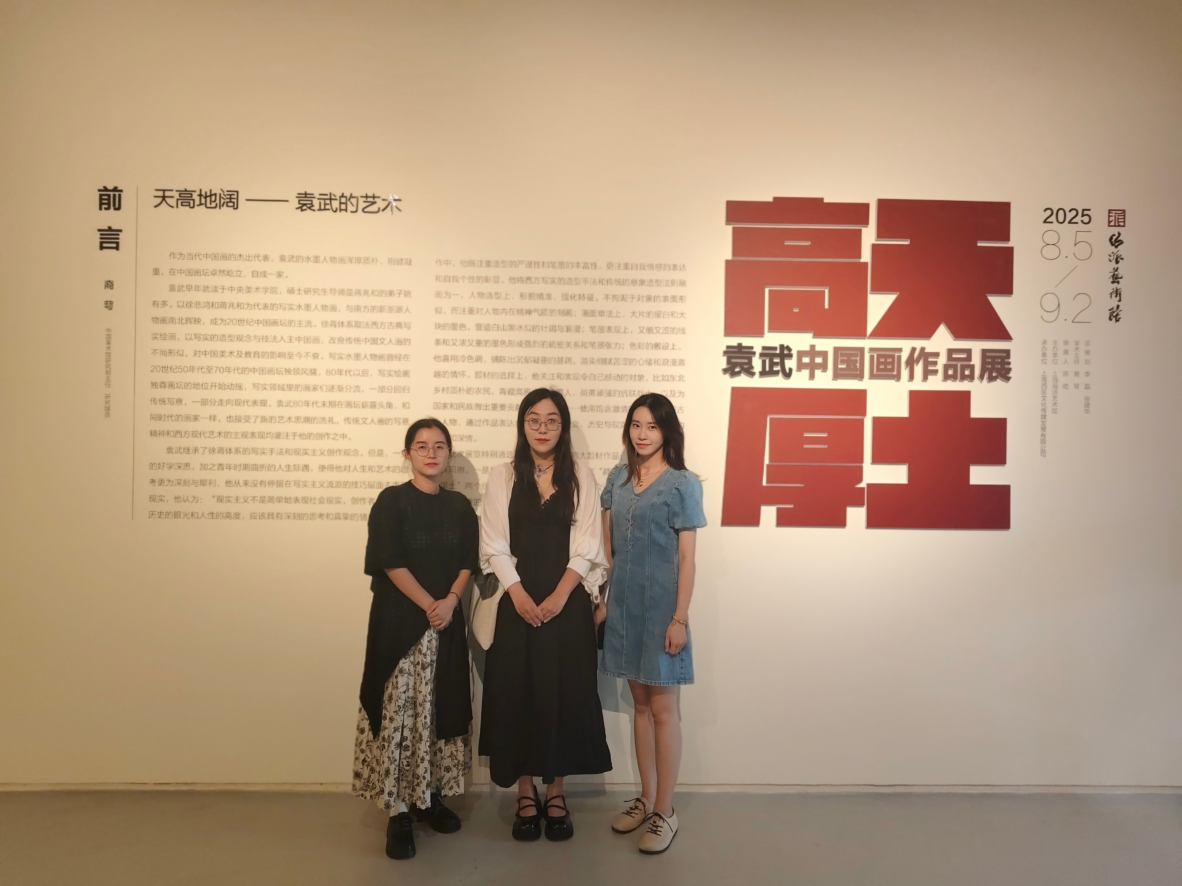 次日,研修团队赴海派艺术馆观摩"高天厚土——袁武中国画作品展"。展览现场,教师们就写意人物画的造型语言、笔墨张力与时代精神表达等课题展开研讨,由此积累了丰富的教学研究素材。