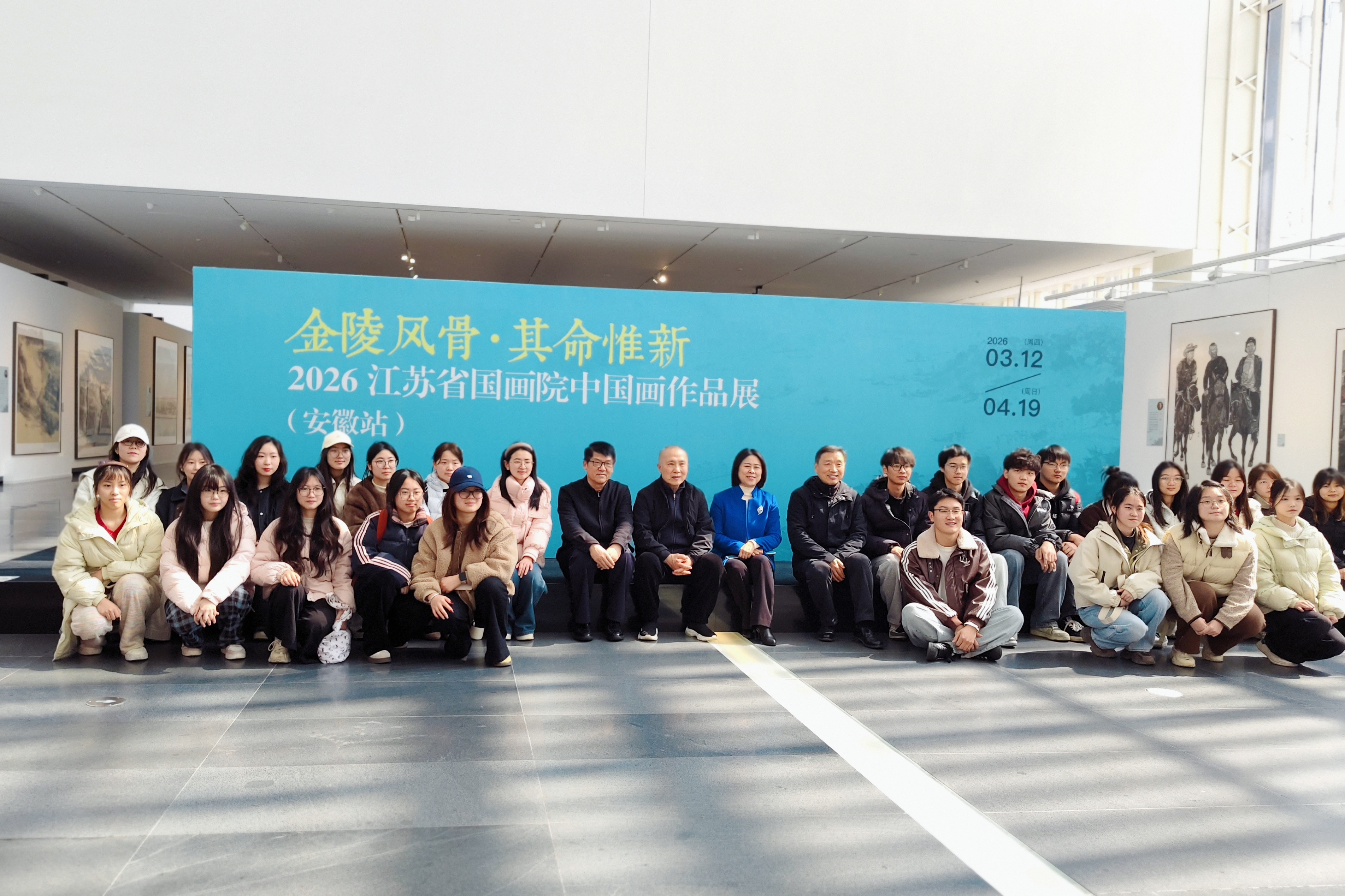 3月12日,“金陵风骨·其命惟新——2026江苏省国画院中国画作品展(安徽站)”开幕式在安徽省美术馆盛大启幕。此次展览作为苏皖两地艺术文化交流汇聚了江苏省国画院老中青三代艺术家的百余幅精品力作,全方位展现新金陵画派守正创新的艺术风骨。美术学院教师王力平、汪清松及三十余名学生应邀参加开幕式,与安徽艺术学院副院长、安徽省美协主席陈林,中国美术家协会副主席、江苏省国画院院长周京新,安徽省文化和旅游厅副厅长李梅梅等嘉宾交流合影,共探中国画传承发展与艺术教育融合之路。