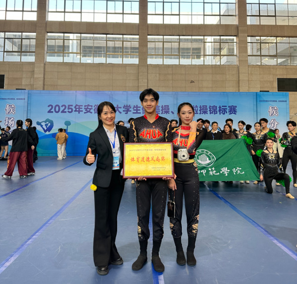 12月4日至7日,由安徽省体育协会主办的2025年安徽省大学生健美操、啦啦操锦标赛在安庆师范大学举行。我校啦啦操代表队凭借出色发挥,在众多参赛队伍中脱颖而出。在爵士项目的角逐中,队员们以极具感染力的舞蹈动作、精准的节奏把控和富有张力的舞台表现,荣获丙丁专业组双人爵士项目第一。在街舞项目中,队员们同样展现出了高超的街舞技巧和团队协作能力,斩获丁组街舞项目第二名。
