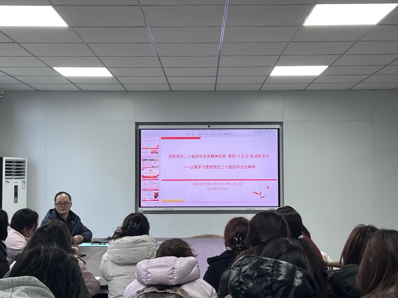 2025年12月26日,党的二十届四中全会精神宣讲会在一站式学生社区会议室召开。本次宣讲特别邀请安徽艺术学院马克思主义学院高元龙老师主讲,2025级视觉传达设计专业学生到场聆听学习,感悟全会精神,凝聚青年奋进力量。宣讲会上,高元龙老师以“深悟党的二十届四中全会精神实质 勇担‘十五五’奋进新使命”为主题,围绕党的二十届四中全会核心内容、精神实质及“十五五”规划的部署要求,系统解读了党的二十届四中全会提出的新思想、新论断、新要求。他指出,党的二十届四中全会是在“十四五”规划即将收官、“十五五”规划即将开局的关键节点召开的重要会议,全会系统总结了“十四五”时期我国在经济发展、科技创新、民生保障、生态文明建设等领域取得的历史性成就——经济总量稳步攀升,创新驱动发展战略深入实施,一批关键核心技术实现突破,脱贫攻坚成果持续巩固,民生福祉不断增进,生态环境质量持续改善,这些成就为我国迈向新的发展阶段奠定了坚实基础。高老师表示,青年一代是“十五五”时期国家建设的生力军,肩负着推动国家发展、民族复兴的重要使命,广大青年要深刻认识时代赋予的责任,将个人理想融入国家发展大局。同时结合艺术专业特色,阐释了青年