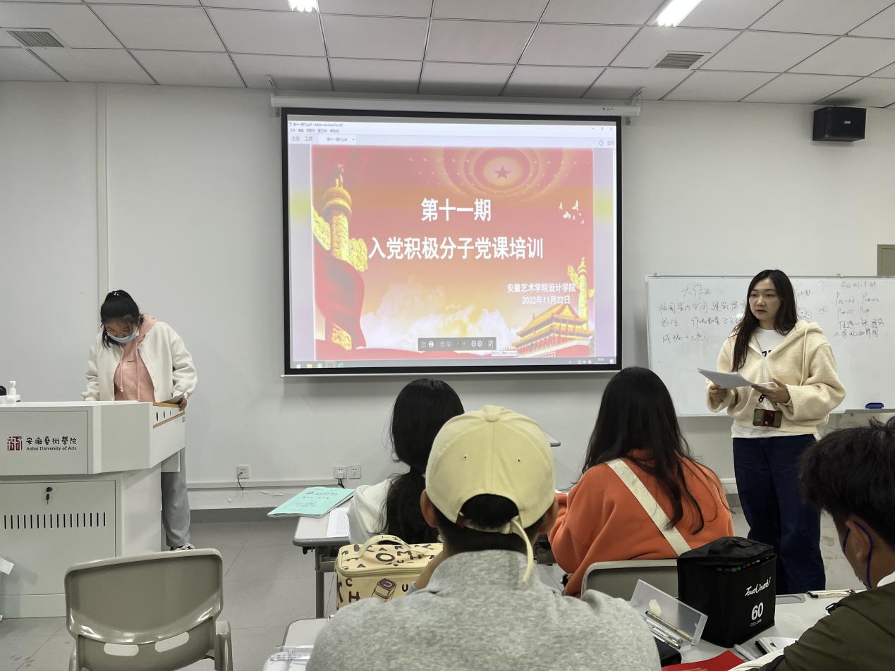 为进一步加强基层党组织建设,11月22日下午,设计学院在设计楼410教室开展关于第十一期入党积极分子培训课。学生党支部书记郗文静、组织兼纪检委员管璐瑶、宣传委员王亚鹏以及第十一期的入党积极分子参加本次会议。会议开始,管璐瑶向参课学生说明入党需要提交的材料及填写要求。郗文静会上带领学生学习中国共产党的结构、中国共产党的性质及最高理想和根本宗旨、中国共产党的义务和权利、身为大学生该怎样做?本次培训圆满结束。入党积极分子们在本次会议收获良多。(撰稿:方毅 摄影:王亚鹏 复审:夏守军终审:陈明)