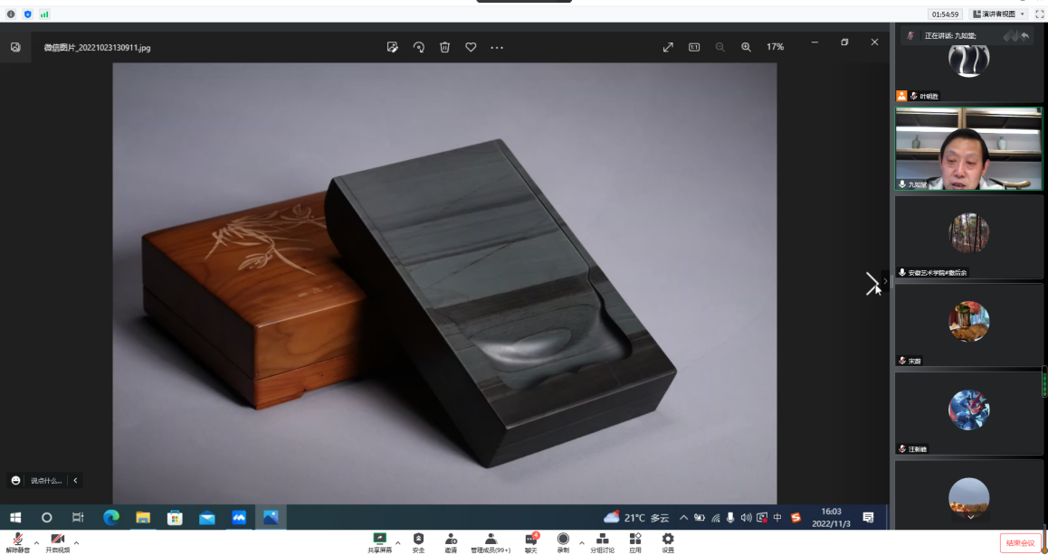 11月3日,蔡永江老师做了题为《歙砚艺术鉴赏与创新》专题分享,从歙砚的开采、石品纹理赏析、传统造型艺术、当代砚雕艺术及创新方面,细致地梳理了歙砚的历史由来、古今演变及其艺术性赏析方面进行了详细的讲述,蔡老师还从自身在歙砚的创作上做了重点解读,讲述了歙砚制作的工艺与艺术追求,为非遗数字化保护带来了创作的来源和新的思考。