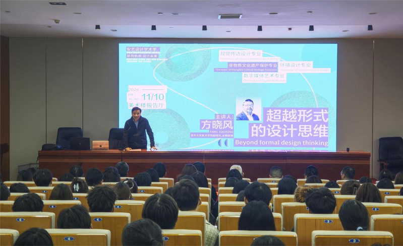 11月10日,一场主题为《超越形式的设计思维》的讲座在安徽艺术学院美术楼报告厅成功举办。本次讲座是“安艺设计学术季”系列讲座之一,由清华大学美术学院副院长,长聘教授博士生导师,中国《装饰》杂志社主编、编委方晓风教授主讲,安徽艺术学院党委委员、副校长陈林主持,设计学院党总支书记俞璋凌作总结讲话。设计学院众多学子与相关教师前来聆听。