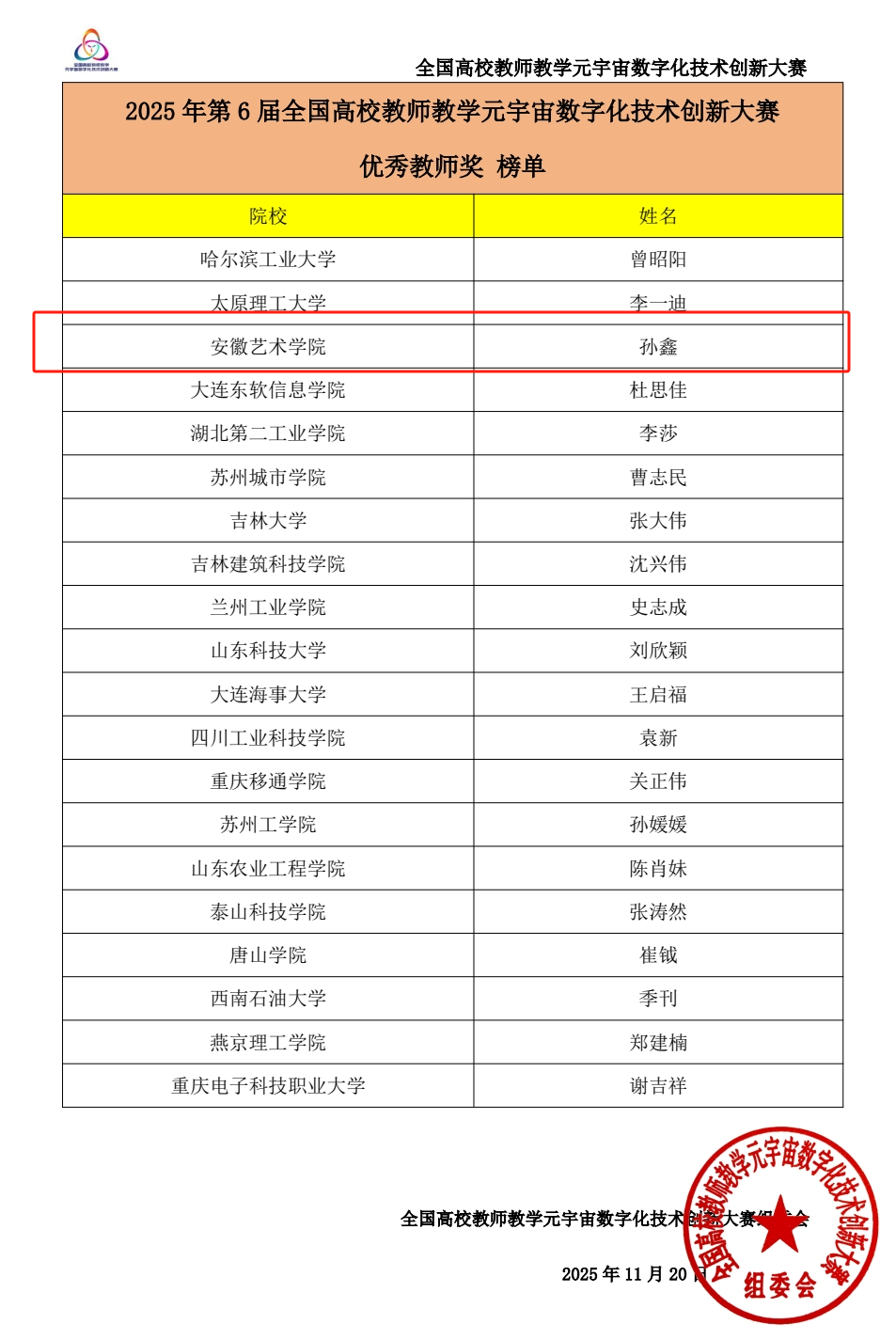 近日,2025年第六届全国高校教师教学元宇宙数字化技术创新大赛总决赛圆满落幕,获奖榜单正式公布。设计学院孙鑫、王骄阳、王瀚三位老师组成的教学团队,凭借其前瞻性的教学设计与卓越的数字化应用能力,在激烈竞争中脱颖而出,荣获全国总决赛二等奖。同时,团队核心教师孙鑫凭借其个人出色的教学创新与实践能力,荣获“优秀教师奖”。