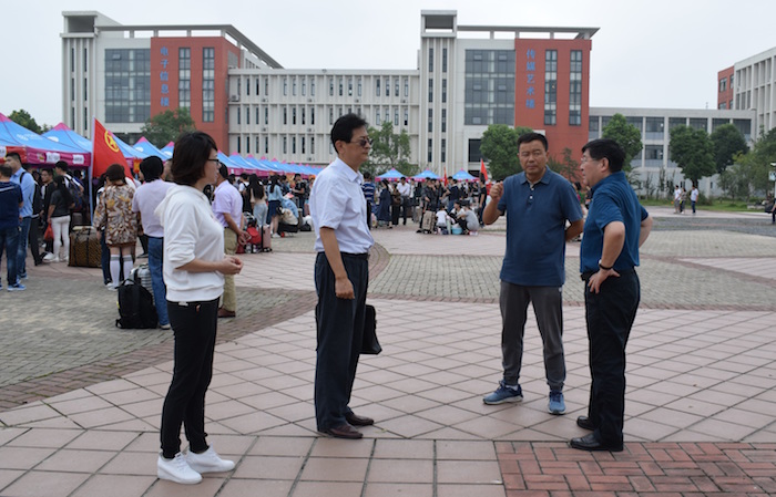 学院党委书记、院长周之虎(右一),副书记沈端良(左二)听取学生处负责人汇报学生报到情况