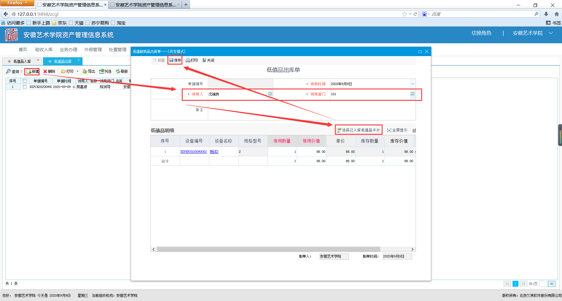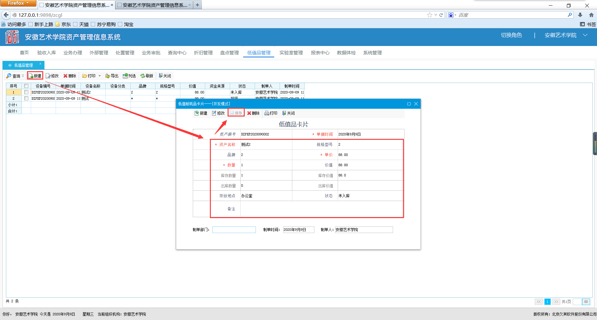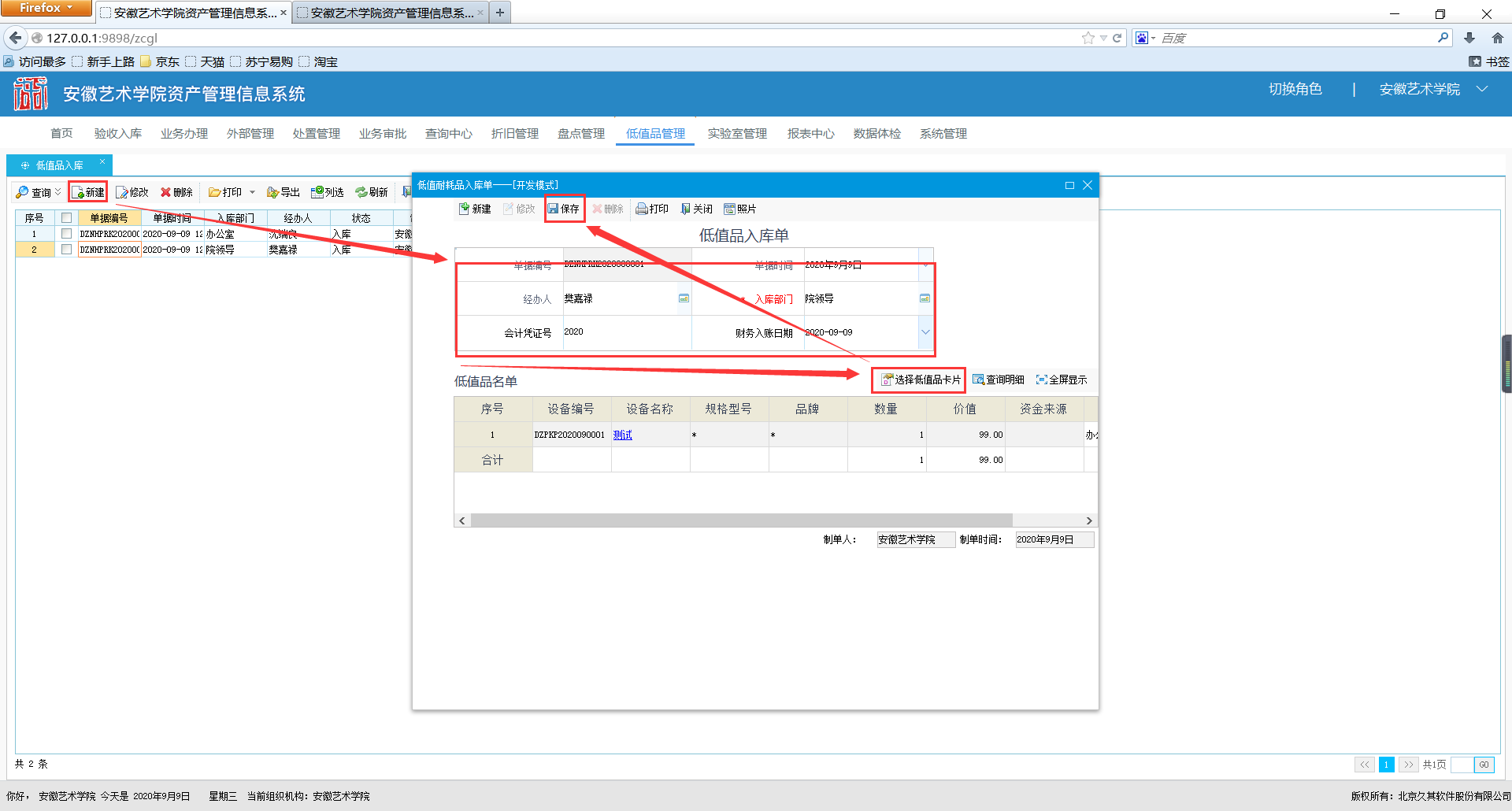进入【低值品入库】功能,点击【新建】,弹出低值品入库界面,选中录入的低值卡片,实现入库,然后点击【保存】。
