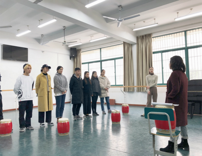 “花鼓灯锣鼓是我国打击乐中的精华之一,它节奏鲜明,极富表现力。花鼓灯舞蹈的节奏、步伐、动律、产生于锣鼓音乐,两者关系极为密切。”王巧以舞蹈先驱吴晓邦先生对花鼓灯锣鼓的阐述作为开场,让同学们了解了花鼓灯锣鼓音乐和舞蹈是紧密相连的。花鼓灯的表演由歌、舞、戏三部分组成,载歌载舞是花鼓灯的特色之一。花鼓灯演出在开场前为招揽观众一般都要先演奏打击乐,主要打击乐器有鼓、锣、大镲、小镲、狗锣。锣鼓队人不需要太多,最好是九人,一面大锣,一个大镲,一面鼓,四至六个狗锣。