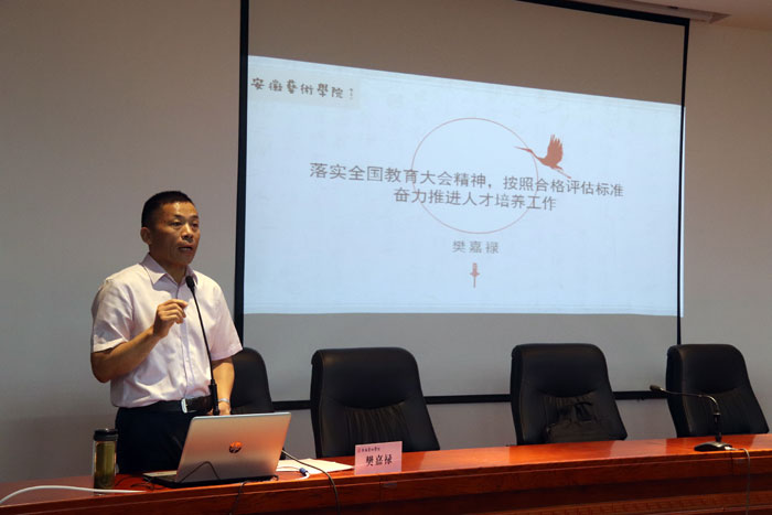 樊嘉禄指出,我们要把学习贯彻全国教育大会精神贯穿人才培养的各项工作之中,广大干部教师应该成为党的教育方针的宣讲员、实践者,要把学习宣传党的教育方针同实践育人紧密结合起来,围绕“培养什么人、怎样培养人、为谁培养人”开展教学管理工作。他强调,安徽艺术学院成功设置后,广大教职工要深入思考“我是谁、我从哪里来、我到哪里去”这些事关学校建设与发展的根本问题;眼下我们必须要做好的工作是按照合格评估的要求做好教学及管理工作,建立健全教学质量保障体系,打造“金课”、淘汰“水课”,教师们要拿作品说话,苦练内功;要按照“三全育人”的要求做好学生工作,严管与厚爱相结合,营造风清气正的环境,用一流的成绩给省委、省政府和安徽人民一个满意答卷。