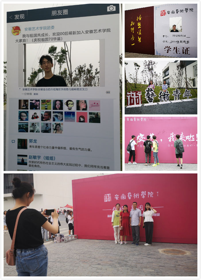 校园里一切早早准备就绪。不仅主干道摆有迎新彩虹门、手绘地图板、报到流程图、四系拟人形象展板、新生签名墙、安全须知等常见迎新设施,教学楼、草坪等处还为新生们准备了可供拍照纪念的大型学生证KT板、带学院定位的“朋友圈”立板等契合00后新生喜好的“打卡”点。各欢迎标语也极尽艺术院校的风格和各系的特色,古雅有平仄工整的对联,深情有“土味情话”,古灵精怪有经典对白借用……随着2019级首届新生的陆续到来,这个周六的安艺校园生机勃勃。