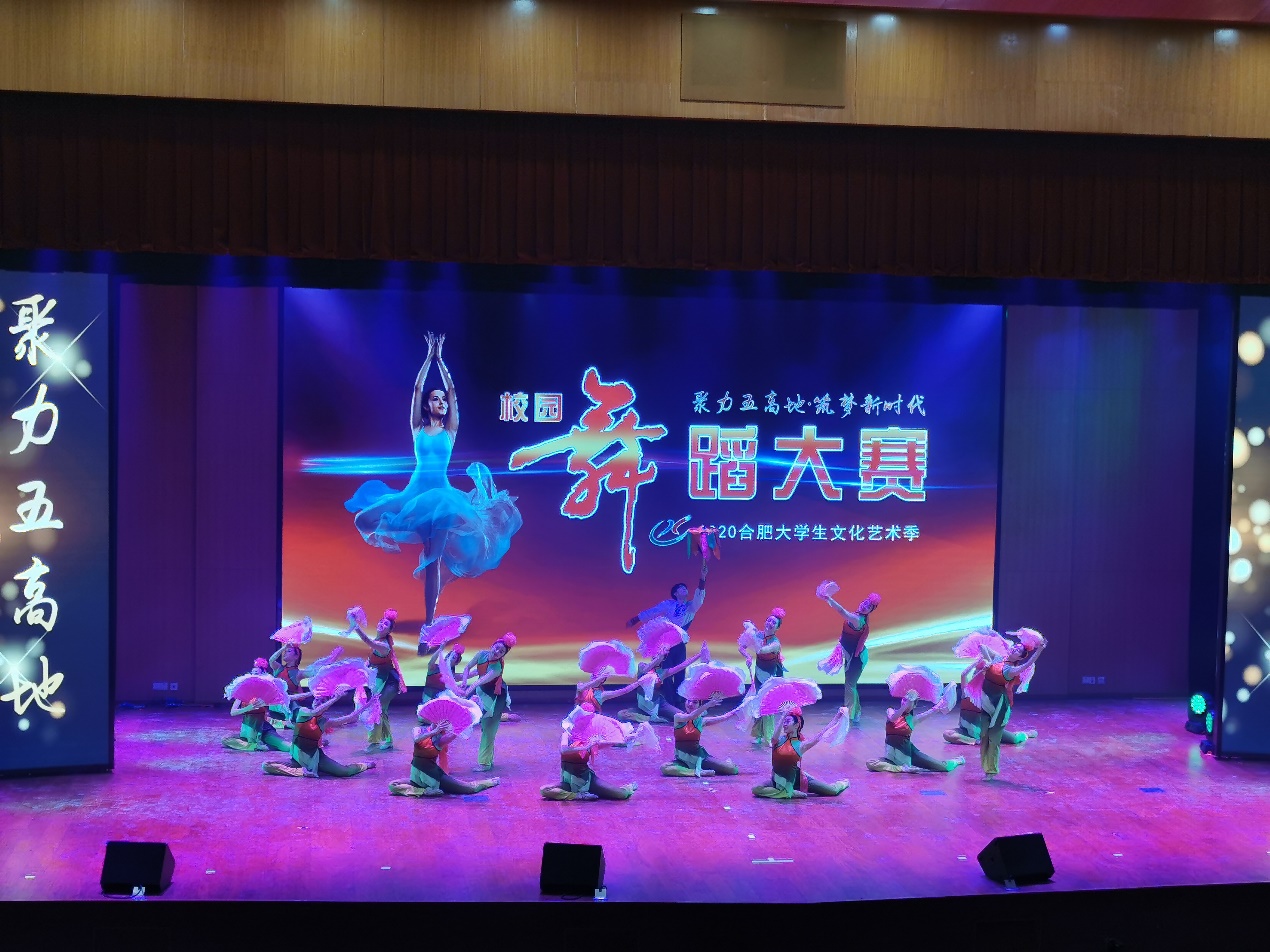2020年11月21日下午,我院24位同学在合肥职业技术学院汇心湖校区参加了由中共合肥市委宣传部、共青团合肥市委员会主办,消遣文化传媒承办的2020“聚力五高地 筑梦新时代”合肥大学生文化艺术季校园舞蹈大赛的决赛。最终我院原创作品安徽花鼓灯舞蹈《花鼓情》荣获了中国舞组总成绩第一名的好成绩。