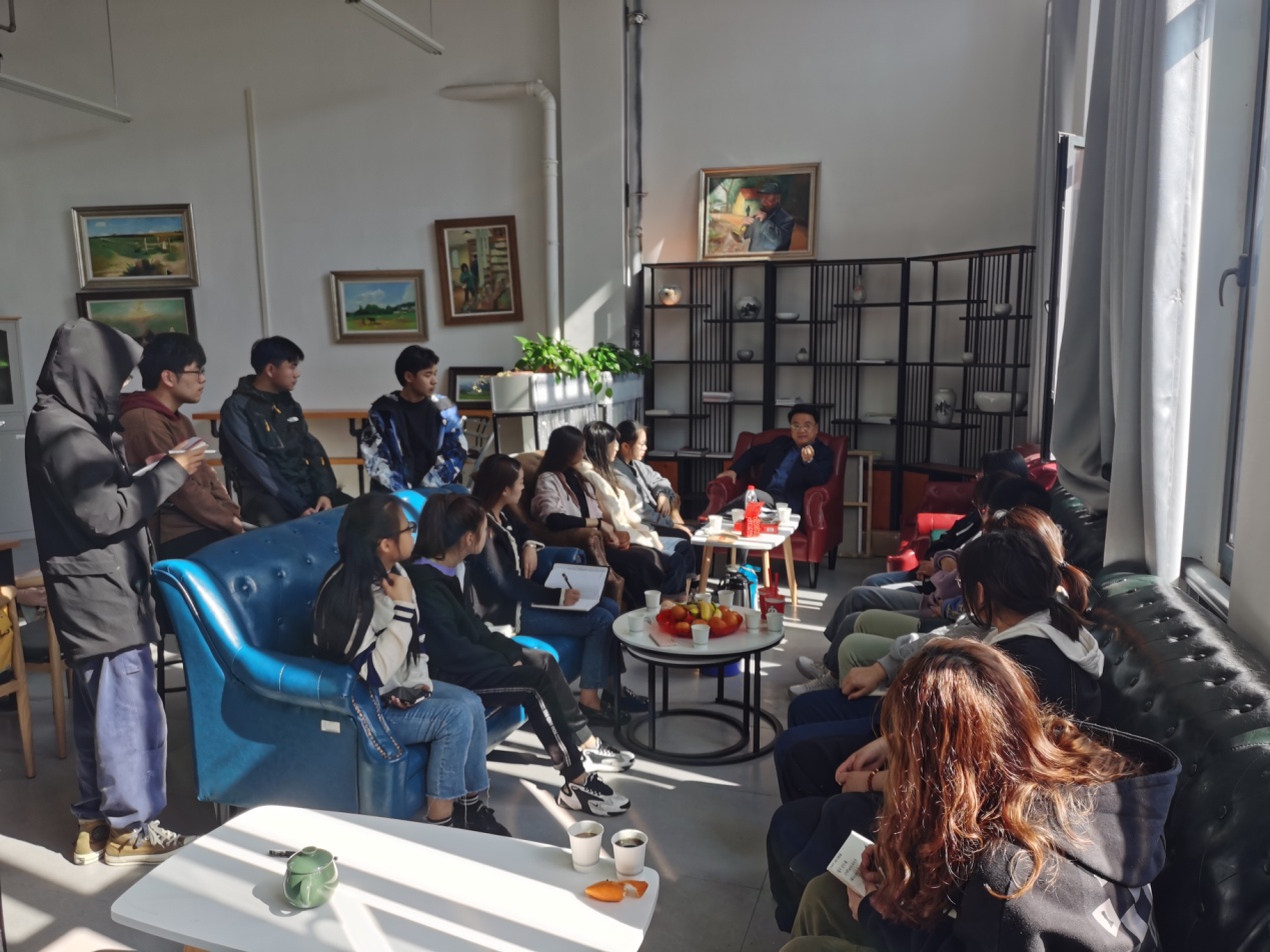 陈明海首先介绍了安徽简称“皖”的由来,指出徽州文化不等同于徽文化,徽州文化是徽文化中重要的一部分。中国文化主要来源于儒释道文化,而这三种文化在安徽也有机的交融在了一起,分别对应安徽的徽州文化、皖江文化和淮河文化。在交流中,陈明海根据同学的提问对徽商、新安画派、桐城派等安徽其他文化派别进行了答疑讲解。他强调安徽艺术学院作为安徽的艺术学院应该要继承安徽灿烂多彩的传统文化,希望大家根据自己的专业把传统文化传承下去。