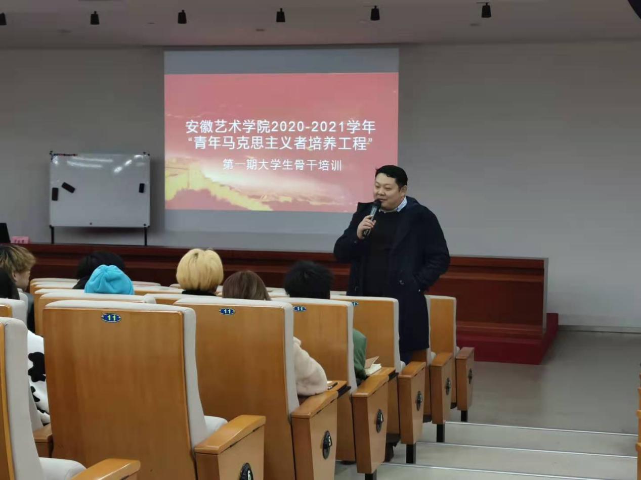 为深入学习宣传贯彻习近平新时代中国特色社会主义思想,提升大学生骨干的思想政治素质、政策理论水平、创新能力、实践能力和组织协调能力,引领我校青年进一步坚定跟党走中国特色社会主义道路的信念,成长为中国特色社会主义事业的合格建设者和可靠接班人,12月22日,安徽艺术学院“青年马克思主义者培养工程”2020-2021学年第一期大学生骨干培训班在美术楼学术报告厅正式开班。校、系两级学生会干部和学生社团负责人参加了培训。