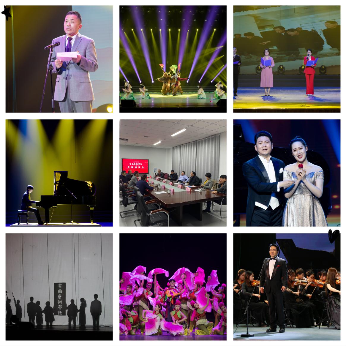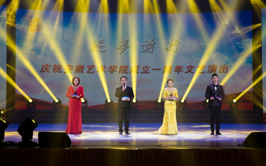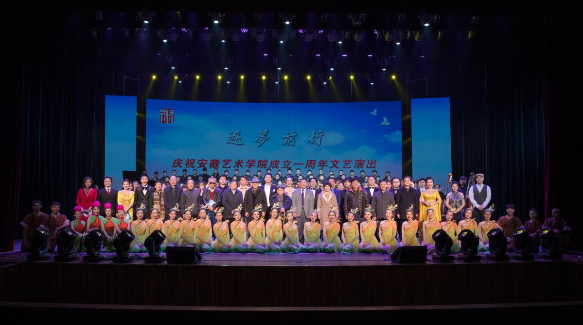 在欢快的旋律中,文艺演出拉开序幕,舞者翩翩而起,歌者放声歌唱,“举杯吧!朋友”,一句深情的咏叹,饱含着对未来的祝福。由四位来自安徽广播电视台的教师演绎的朗诵《开拓者》,赞美了安艺建设者筚路启山林、栉风砥砺行的创业精神,背景视频回顾了7年筹建之路的一个个重要时刻,英才修学府、荒原筑杏坛,时光的叙事让人感动。黄梅戏经典唱段《江山美景万年长》意境高远,我校黄梅戏专业教师、国家一级演员汪晓明扮相儒雅,功力深厚,获得阵阵掌声。原创花鼓灯舞蹈《花落花开》美轮美奂,讲述了花鼓灯艺术代代传承的故事,也展示着安艺人弘扬安徽艺术的担当。浪漫的灯光下,屡获国际钢琴比赛大奖的青年教师侯艺翔,为大家演奏了李斯特的作品《追雪》以及舒曼《狂欢节》选段,精湛技艺令人赞叹,悠扬琴声使人陶醉。男中音张祖顺和女高音宁艺轩演唱的二重唱《让我们携手同行》选自莫扎特的经典歌剧《唐璜》,两人表演生动,音色华丽,带领观众走进充满魅力的歌剧世界。原创花鼓灯舞蹈《希望的田野》聚焦小岗村村民“按红手印”的故事,用艺术记录时代,用作品讴歌人民,展现了安艺人的艺术价值追求。光影秀《追梦路上》通过美术专业毕业生的视角,讲述了学生眼中安艺一年来的变化,创意十足。由安徽艺术学院交响乐团演奏的《加勒比随想曲》大气磅礴,抒发了安艺人向着星辰大海乘风破浪的豪情,国家一级演员孙来法教授随后在现场乐团伴奏下,深情演绎《再见了大别山》。演出最后,交响乐团和青年合唱团闪亮登场,一曲《布兰诗歌》气势恢宏,为安艺送上美好祝愿!“神州大地新时代凯歌高奏,锦绣江淮美画卷万象更新……”在热烈鼓舞的气氛中,文艺演出圆满结束。