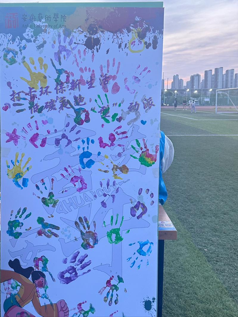 夜跑出发指令发出后,两名旗手在队伍最前方领跑,其他同学手持荧光棒,随着落日余晖,环绕校园奔跑。与此同时,环保时装设计展也吸引了众多目光,现场展示了5件同学们用环保材料制作的服饰,前来参观的同学们可以为心仪的作品投出一票。服装展旁边的手印墙打卡也吸引了众多参与者,每个手印都展现了同学们支持环保公益,建设美丽校园的决心。“物·生·回”二手物品交易开始后,同学们变身成“掌柜”,拿出自己的闲置物品摆成摊位,互相交换或售卖。倡导循环利用,勤俭节约的理念。操场音乐会将整场活动推向高潮。清音社和AYC Hiphop的成员带来了精彩的音乐表演。同学们坐在草地上,跟随着音乐的节奏摇摆,感受着音乐的魅力,也享受着青春的美好与精彩。