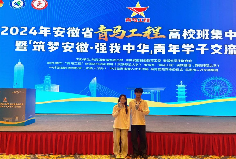 10月17日至10月20日,2024年安徽省“青马工程”高校班集中培训暨“筑梦安徽·强我中华”青年学子交流营在芜湖海螺国际会议中心顺利举办,我校张梦蝶、钱勇参加本次活动。