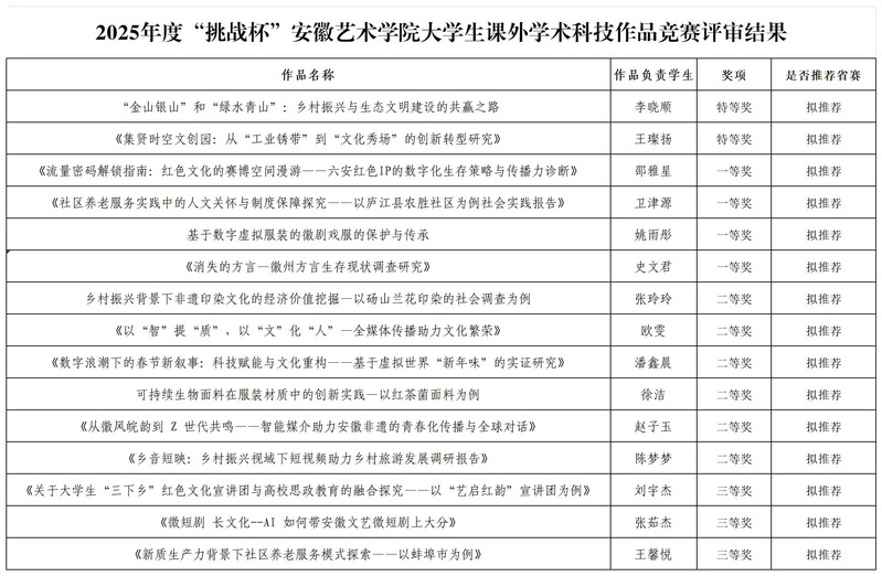 近日,我校举行2025年度“挑战杯”安徽艺术学院大学生课外学术科技作品竞赛校赛决赛。