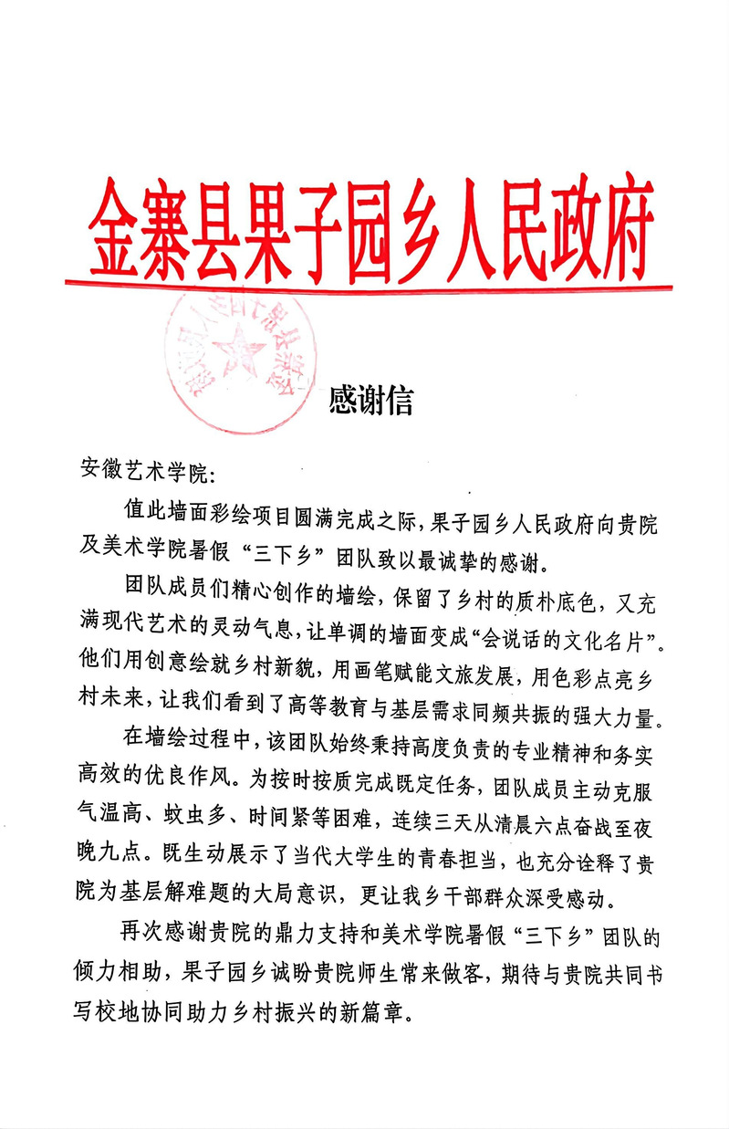 8月30日,金寨县果子园乡人民政府向安徽艺术学院暑期“三下乡”社会实践团队发来感谢信,对团队圆满完成墙面彩绘项目、助力乡村文化建设表示高度认可和诚挚感谢。