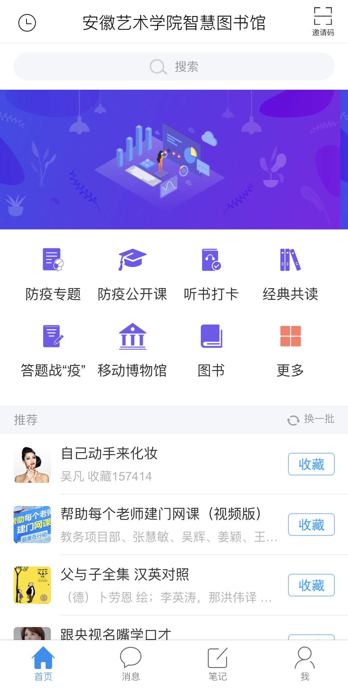通过搜索“学习通”app或者直接扫描下方二维码进行下载,使用手机号注册登录后,点击首页右上角邀请码并输入“ahysxy”,即可进入安徽艺术学院智慧图书馆。