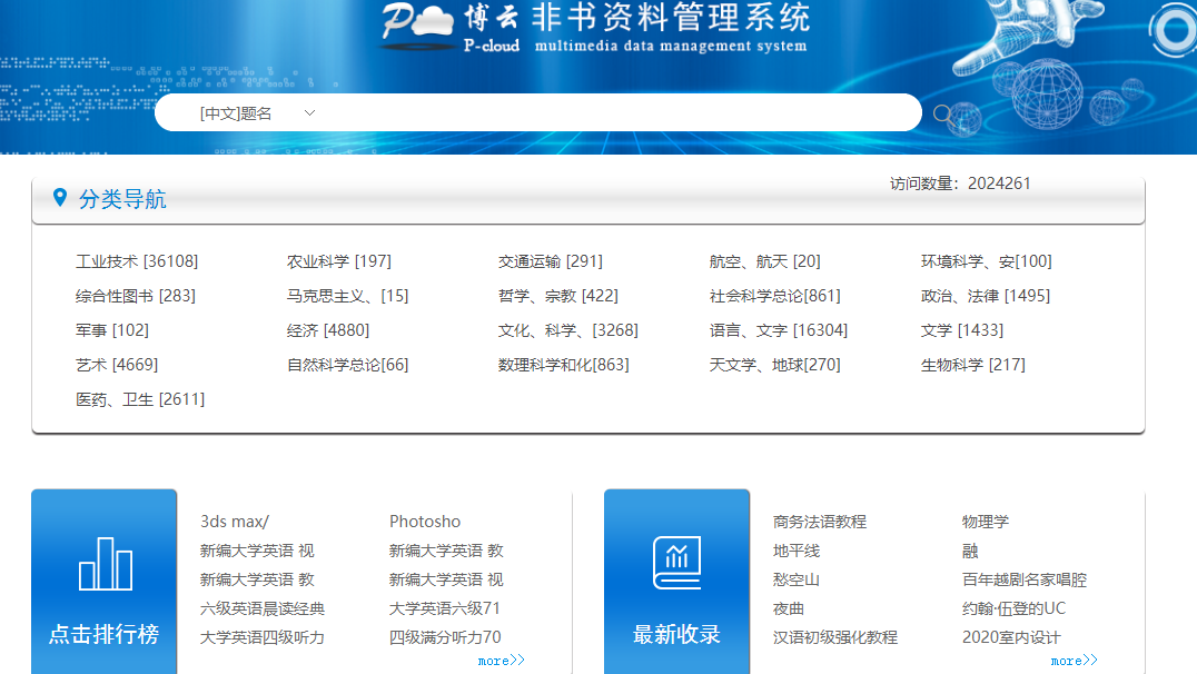 点击“平台建设”子栏目,选择“非书资料资源中心”可以查到并使用艺术、文化、科学等21个大类的图书所配套的随书光盘。