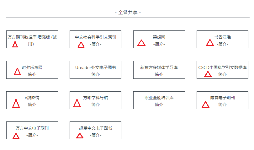 点击“团购资源”模块“全省共享”栏目可检索使用一批全省高校共享的数据库