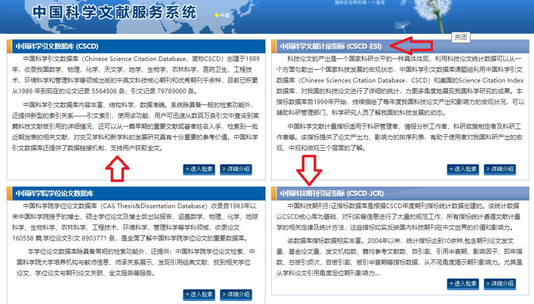 其中,“中国科学文献服务系统”因平台购买原因,只有“中国科学引文数据库”、“中国科学文献计量指标”、“中国科技期刊引证指标”可以进行查找搜索。