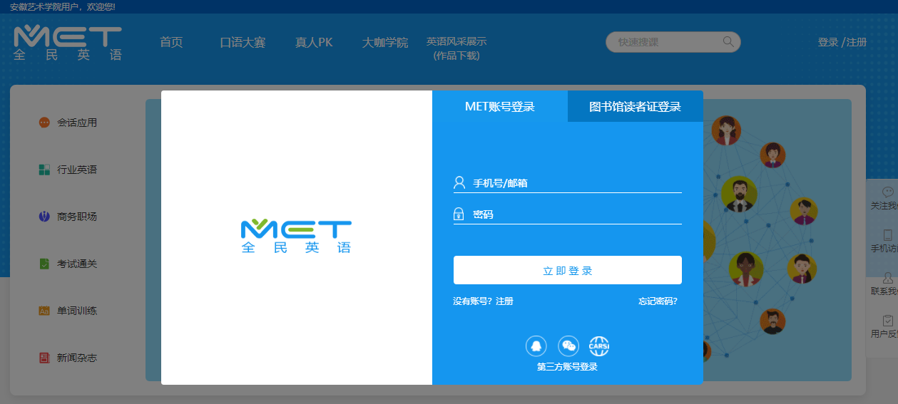 “MET全民英语”是中国图书馆学会阅读推广委员会主办的全国“图书馆杯”全民英语口语风采展示活动赛事平台。通过互联网和计算机,模拟英语交流环境,为广大英语学习者提供一套基于英语听说学习、交流、竞技的平台,有效提高英语的应用能力。