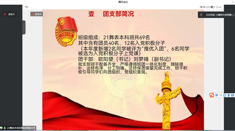 舞蹈学院团总支委员在听取各团支部书记汇报后,对各团支部的书记的工作进行酝酿讨论并做综合评定,对各团支部“对标定级”自评结果进行复核后评定了相应等级。本次“对标定级”复核认定了五星级团支部3个,其余为四星级团支部。学院团总支书记贾方敏进行总结发言,指出本次各团支部书记述职暨“对标定级”复核会议有以下三个目的:一是对过去一年工作开展情况进行系统的梳理,对照标准发现缺点和不足;二是各团支部通过本次会议,互相借鉴学习,取长补短,进一步优化团支部建设;三是通过反思和总结,对表现优秀的提出表扬,对表现不足的提出整改意见,有利于提高团支书工作积极性,形成各支部竞争氛围,提升团组织服务水平。通过本次会议,舞蹈学院团总支有序完成了各项工作,会议取得圆满成功。(撰稿:高玉萱 摄影:高玉萱 初审:王文杰 复审:贾方敏 终审:徐芳)