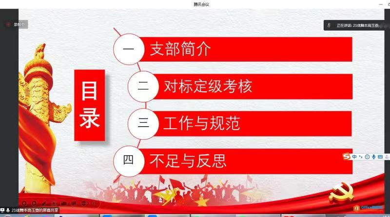 为深入学习宣传贯彻党的二十大精神,指导推动团支部加强建设、规范运行,不断提升组织力,彰显政治功能和社会功能,12月21日下午,舞蹈学院团总支召开线上团支部书记述职暨团支部“对标定级”工作复核认定会。会议由舞蹈学院团总支书记贾方敏主持,舞蹈学院团总支委员、各团支部书记参会。