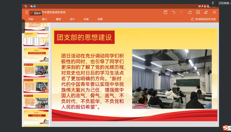 根据上级文件要求,由于支部成立时间不一,2022级团支书着重进行工作述职,2021、2020级团支书着重进行述职和开展支部“对标定级”自评汇报。述职工作主要就各班的日常教育管理,“三会两制一课”、主题团日等制度落实,志愿服务活动、意识形态工作等开展。团支部“对标定级”工作中各班团支书分别就本支部的班子建设、团员管理、活动开展、制度落实以及发挥的作用等方面的工作进行阐述并进行自评打分。各团支部总结了工作中存在的不足之处并汇报了下一年度班级各项工作的计划和目标。各团支书表示在今后的学习工作中会及时总结反思,勇于创新,注重实效,继续在行动中坚守知行合一,在反思中不断改进提升。