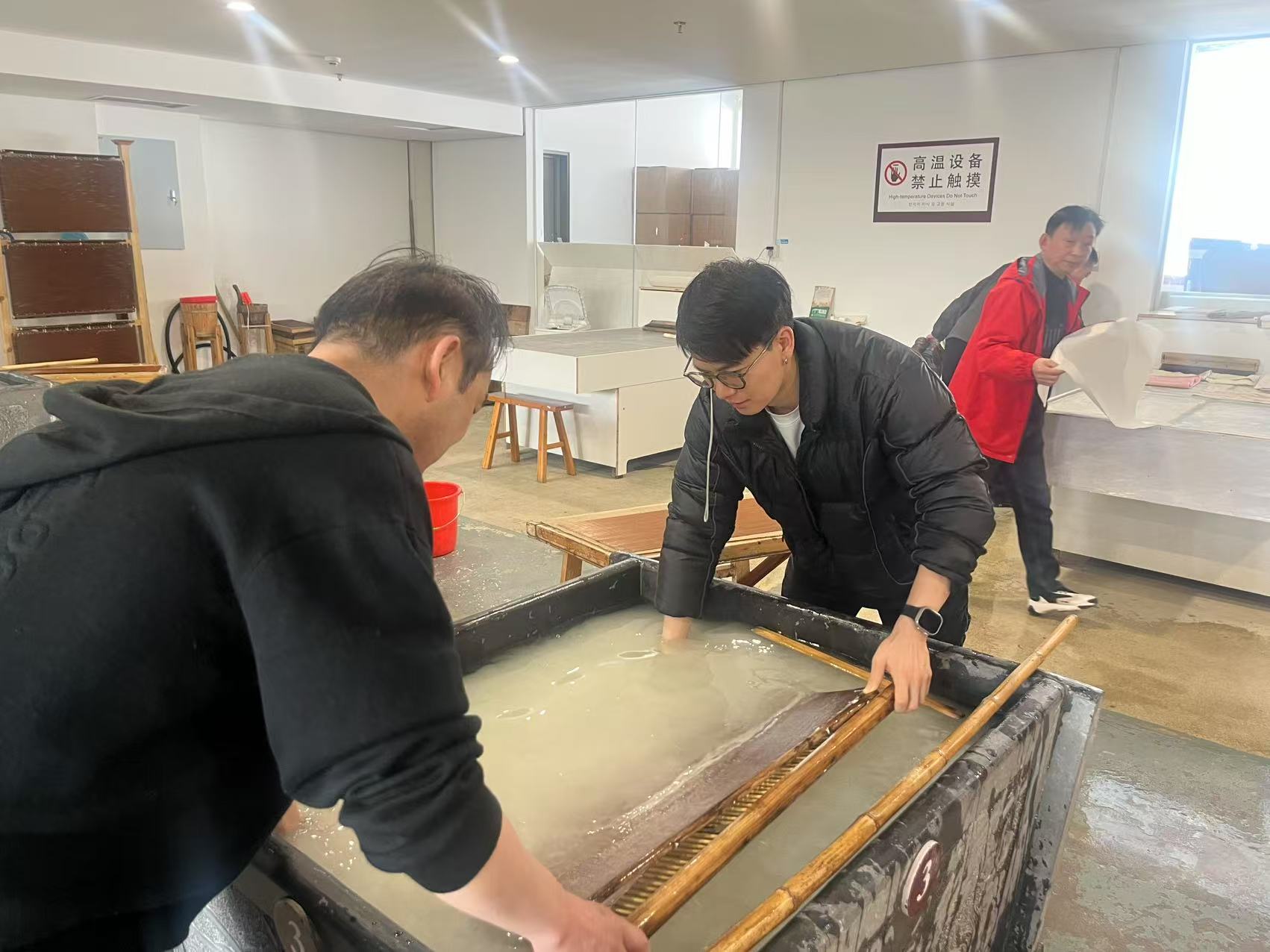 在宣城市舞蹈家协会主席屠丹丽陪同下,调研团队首站前往了宣城市宣笔一厂,细致了解了关于宣笔制作工艺、功能分类以及传承推广等方面的介绍,参观了宣纸的制作车间,并亲身体验了宣纸的制作流程。