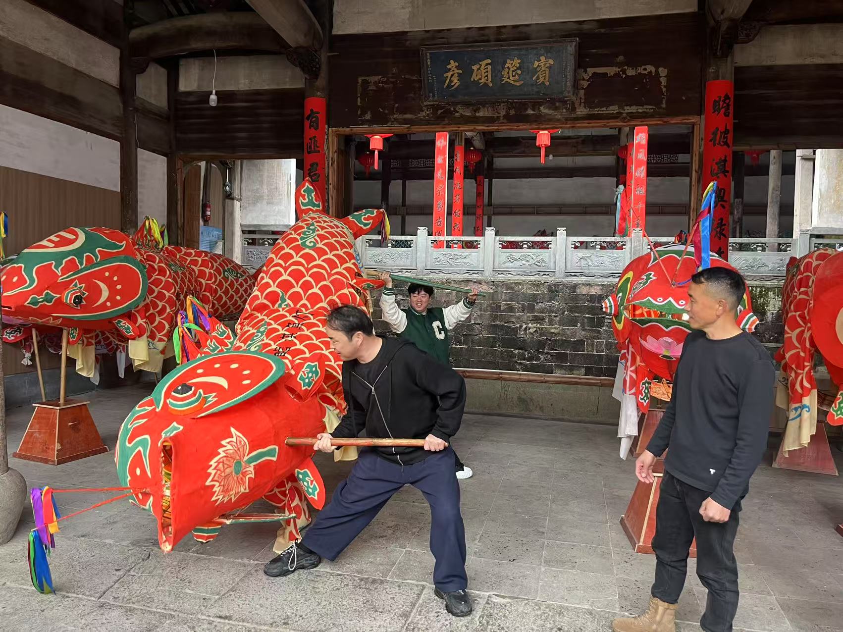 3月9日,团队转赴黄山歙县,对瞻琪鱼灯表演团队开展访谈。队长郑冬蛟系统讲解了瞻琪鱼灯的历史沿革,并传授“两步半”基础步法和“鲤鱼摆尾”“鱼腾千里”“如鱼得水”和“鱼跃龙门”等经典动作。